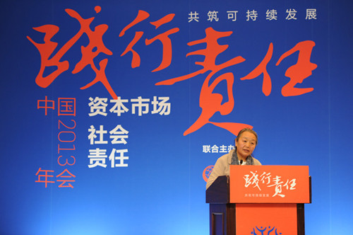 圖為公司董事長雷菊芳女士在中國資本市場2013社會責任年會上做主題發(fā)言。