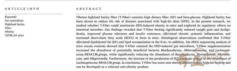 青稞高纖粉(T-fiber)含有較高的膳食纖維(DF)和β-葡萄糖。青稞已被證明可以降低與高脂肪飲食(HFD)相關(guān)的疾病風(fēng)險。這篇論文主要研究了西藏青稞高纖粉(T-fiber)是否能改善HFD誘導(dǎo)的小鼠肥胖,并探討了其對腸道微生物的影響。結(jié)果表明,青稞高纖粉(T-fiber)喂養(yǎng)能夠顯著減少小鼠體重增加、改善葡萄糖耐量和胰島素抵抗、緩解慢性全身炎癥,同時小鼠糞便中短鏈脂肪酸(SCFA)也有增加??傊囡呃w粉(T-fiber)具有一定的抗肥胖能力,可以作為相關(guān)的抗肥胖產(chǎn)品來進(jìn)行開發(fā)。