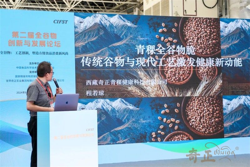 甘肅奇正實業(yè)集團有限公司總經(jīng)理、西藏奇正青稞健康科技有限公司董事長程若瓊先生在大會發(fā)表講話,圍繞“青稞全谷物脆:傳統(tǒng)谷物與現(xiàn)代工藝激發(fā)健康新動能?”提出:青稞是全谷物家族的新勢力。